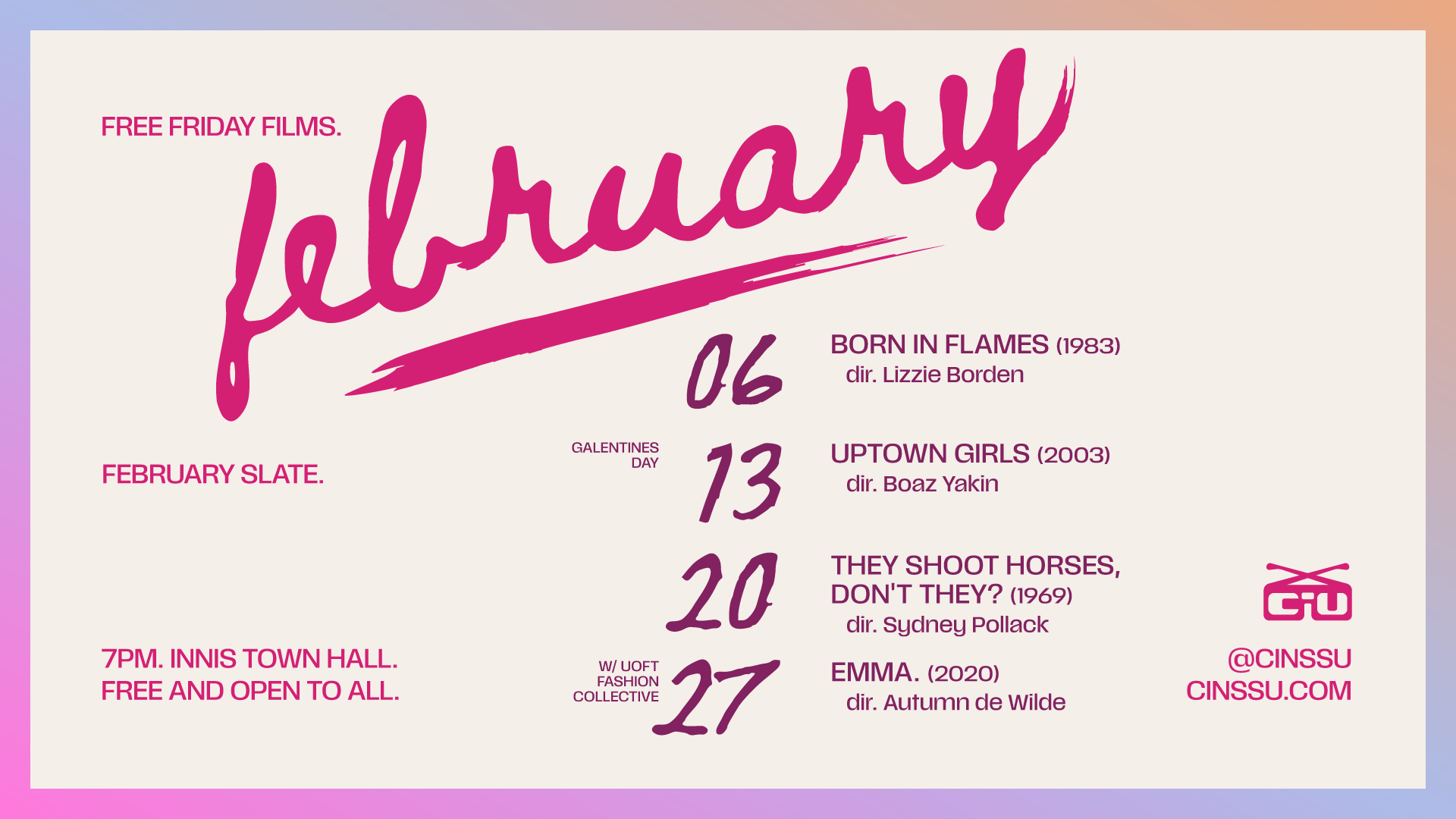 Every Friday, we screen a film at Innis Town Hall, 7PM! Totally free! No tickets! Just show up!