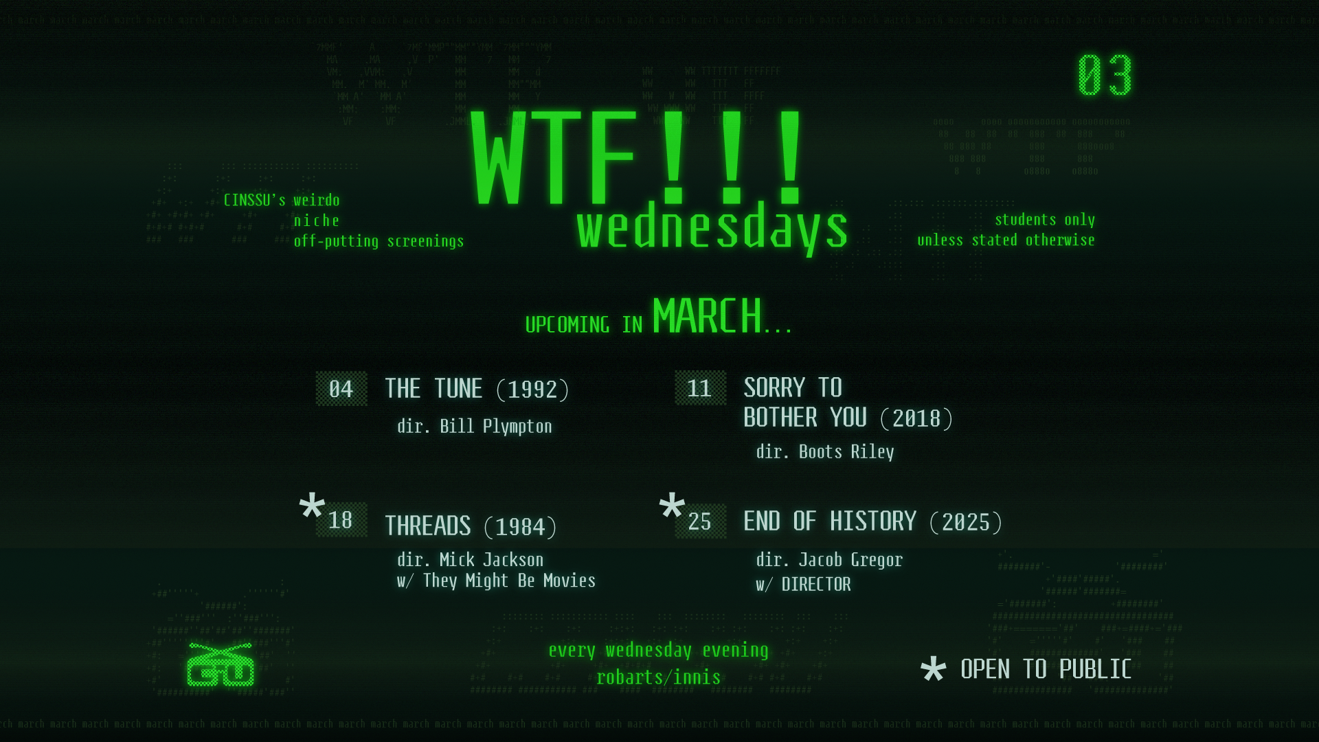 WTF WednesdayExperience something weird…Every Wednesday…Evenings at Innis College or Robarts Library.Find Out What We're Screening: WTF?!? ★ WTF?!? ★ WTF?!? ★ Slide 1 Slide 1 (current slide) Slide 2 Slide 2 (current slide) Slide 3 Slide 3 (current slide) Slide 4 Slide 4 (current slide)